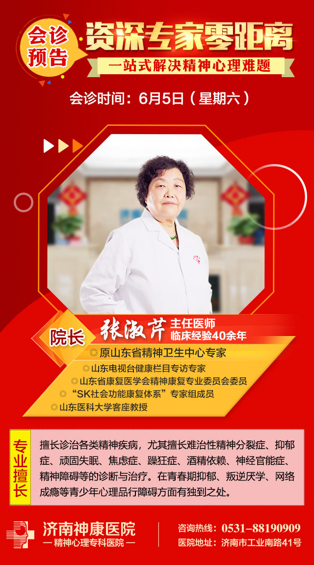 6月5日(本周六),原山东省精神卫生中心精神科主任医师、济南神康医院张淑芹院长开展零距离会诊活动。届时张院长将会对久治不愈的失眠,抑郁,焦虑,精神分裂,酒精依赖症、神经衰弱、强迫症、躁狂症、双向情感障碍等患者,进行零距离详细问诊,解答患者疑虑,提供个人专属诊疗方案,一站式解决精神心理疑难疾病困扰。为保障会诊质量,每日限20人,抢约热线:0531-88190909