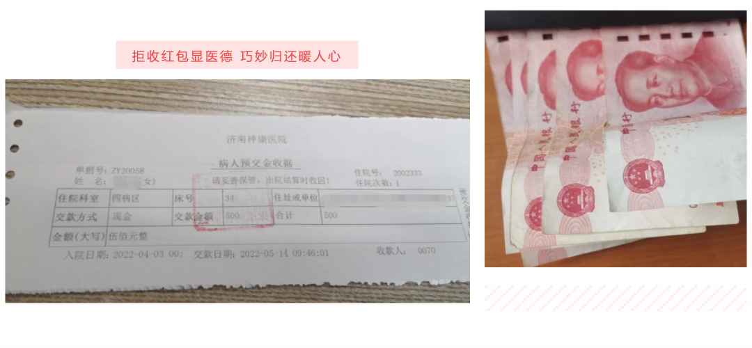 近日,济南神康医院四区住院患者季女士家属收到了一张住院押金收据,这500元钱本是送给该病区魏医生的一份“心意”,没想到,红包又以这种方式“回到”了他的手中。